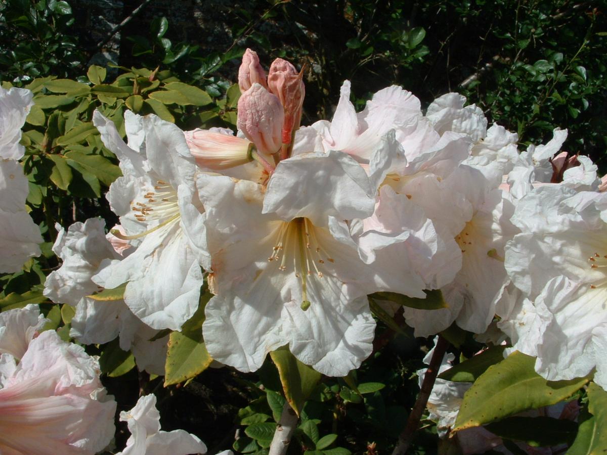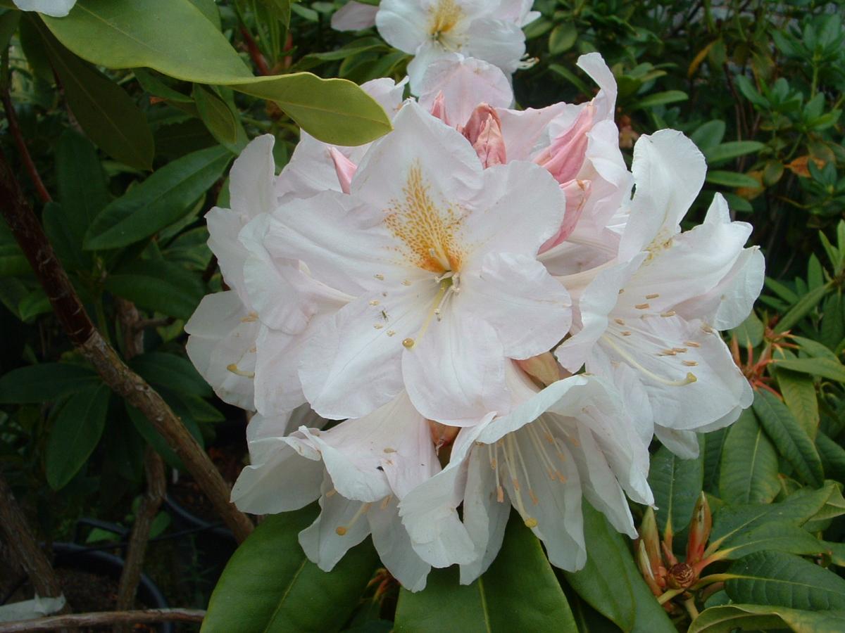 Flowers: compact round trusses of about 16 large white flowers tinged lavender with a brownish flare.