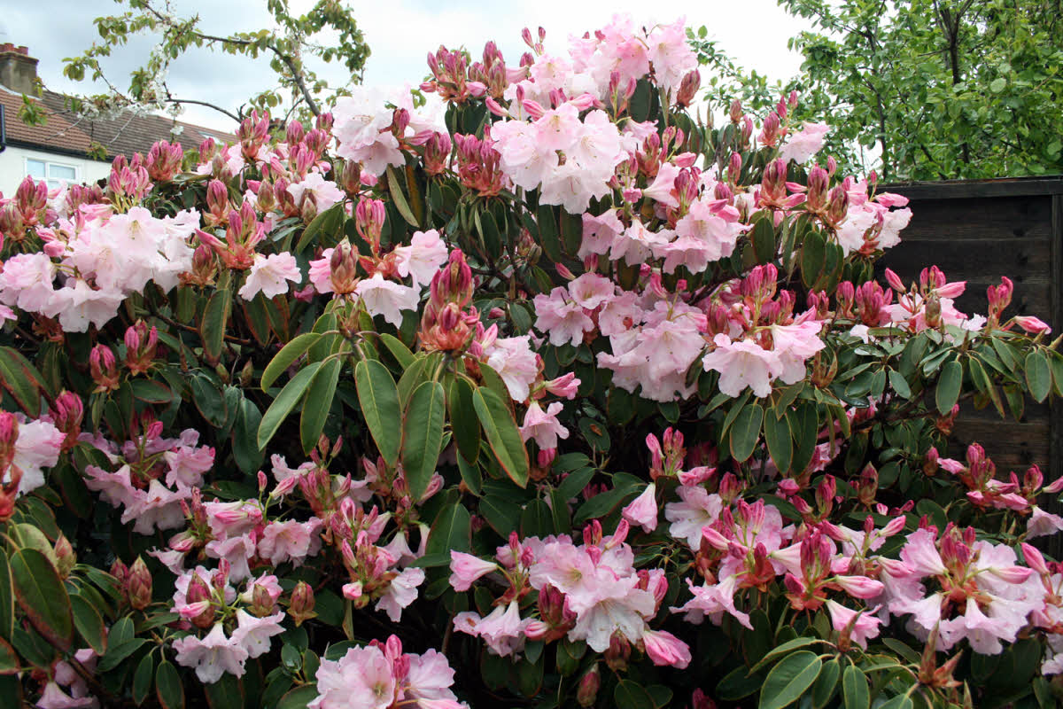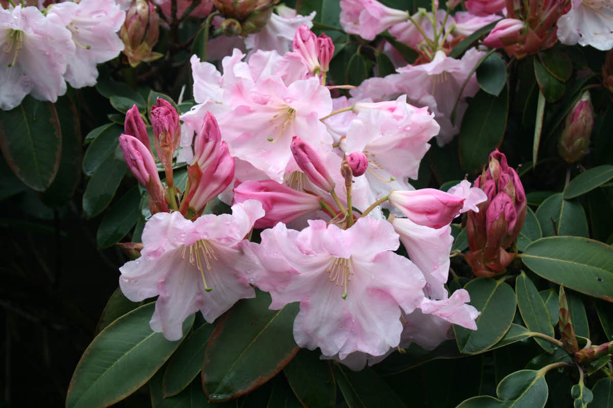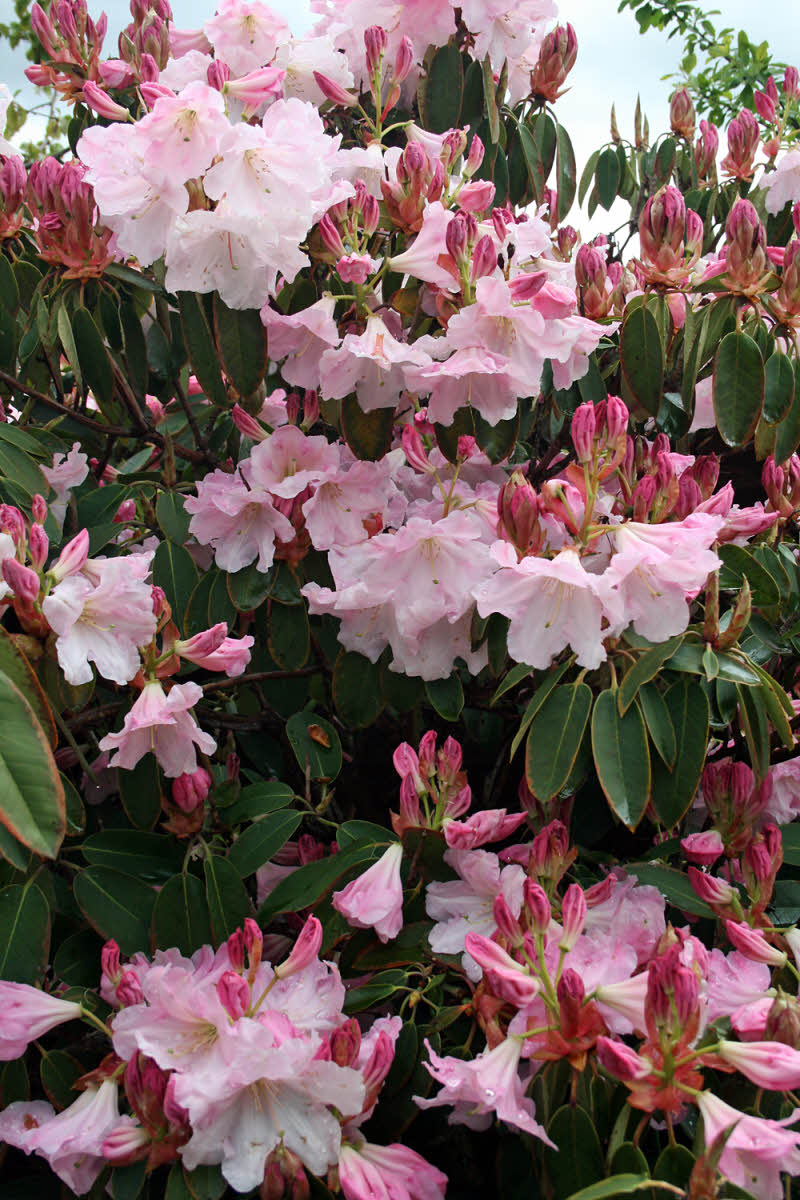 Rhododendron 'Loderi Sir Edmund'fortunei ssp. fortunei x griffithianum Loder pre 1920AM 1930Flowers: waxy, veined pink at first but fading to a clear, blush pink; scented.