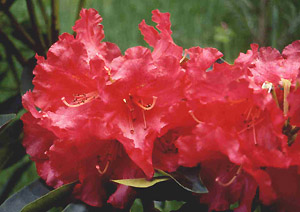 Flowers: 12/truss, openly campanulate, 125mm wide, scarlet red with a few faint darker spots.