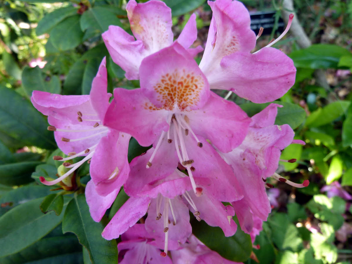 Flowers: c13/compact truss, broadly funnel-shaped, c45 x 60-70mm, bright rose pink, with a v-shaped, yellow ochre blotch.