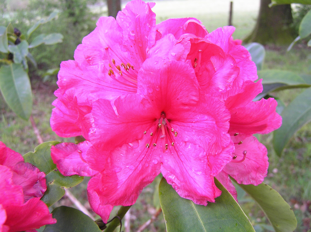 Flowers: c12/truss, broadly funnel-shaped, 65 x 80-90mm, glowing crimson in bud, opening dark satiny pink,