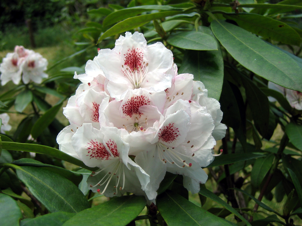 Flowers: 16-19/compact, globular truss, funnel-shaped, c45 x 50-65mm, with wavy-edged lobes, white, with reddish