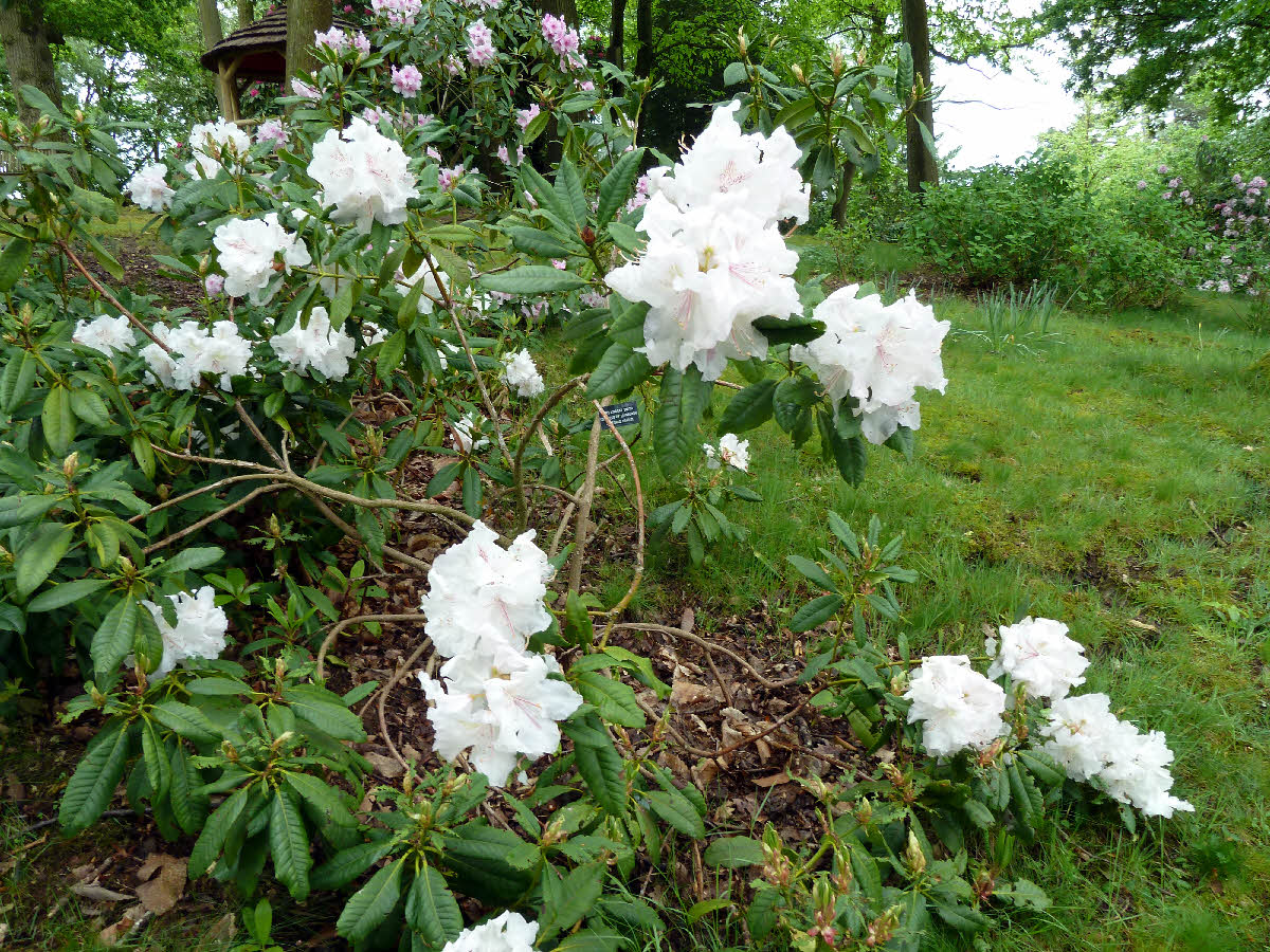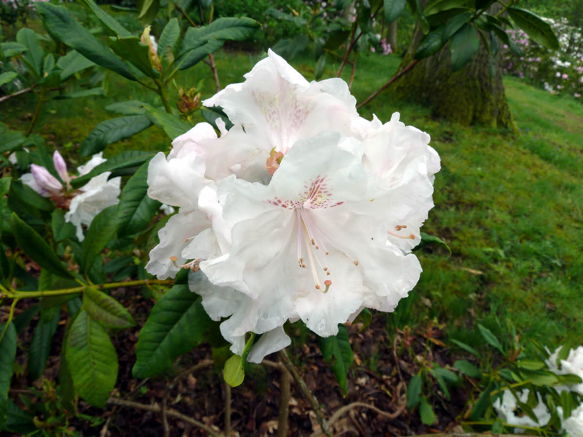 Flowers: c10/truss, broadly funnel-shaped, 60-80 x 90-120mm, 5-6 lobed, rosy mauve in bud, opening white, with a tinge of mauve and a ray of brown crimson markings changing to green and fawn.