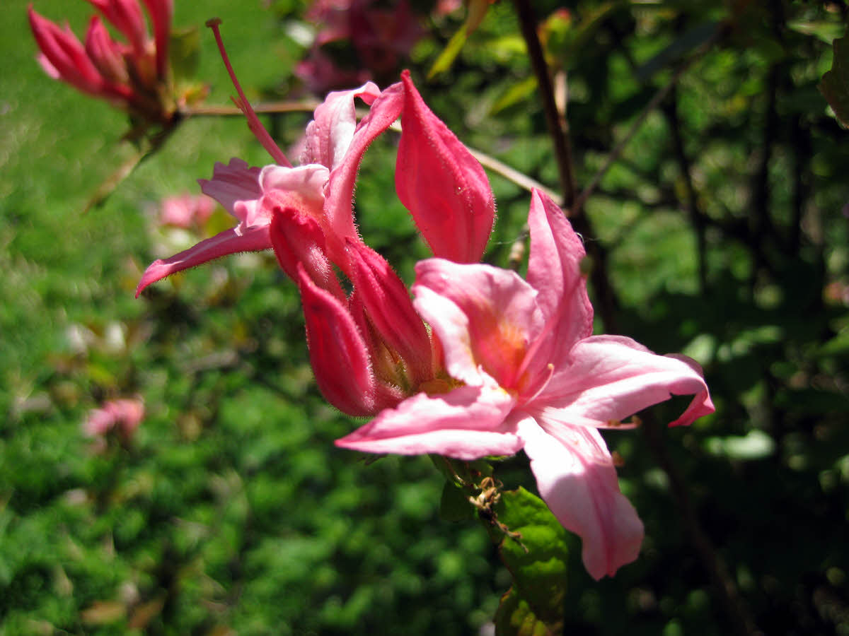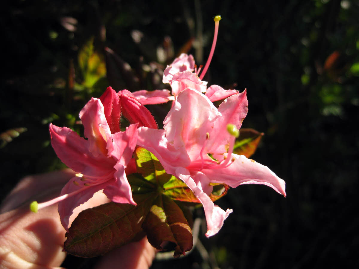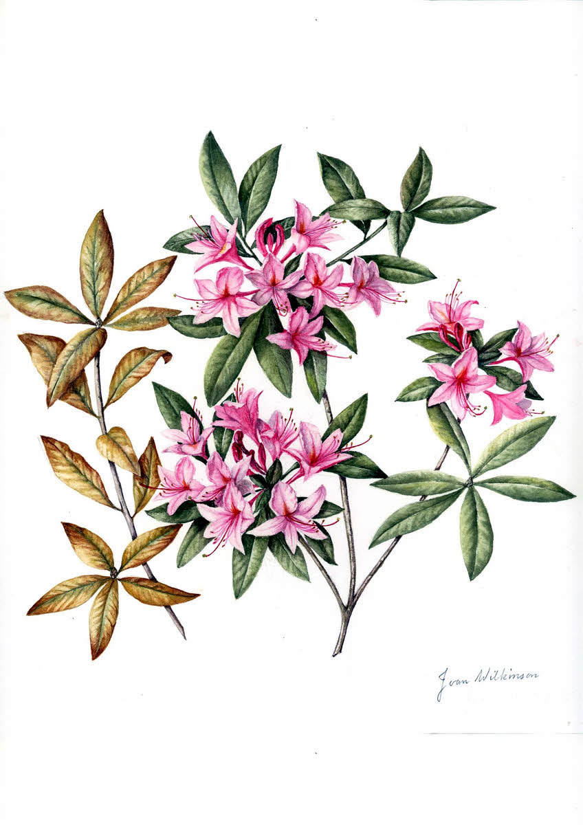 Flowers: single, 8-10/loose truss, narrowly tubular funnel-shaped, 50 × 40mm, with 5 wavy-edged lobes, deep pink (52B) in bud, opening white flushed light purplish pink (55C) inside, outside strong purplish pink (55B); a blotch of light yellow (12C) suffused over the dorsal lobe; stamens deep pink. Calyx 5mm long, brilliant yellow-green (149C).