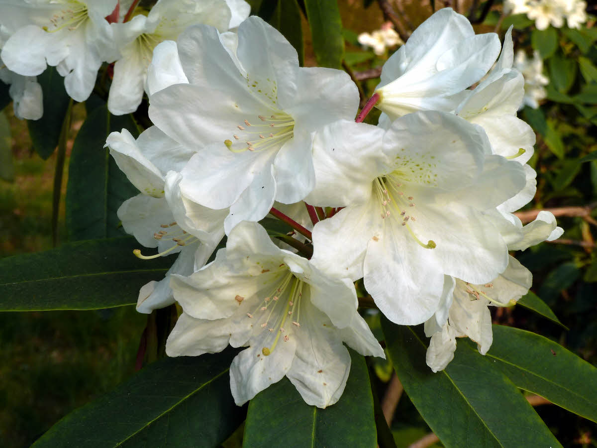 Flowers: 8/compact, globular truss, funnel-shaped, 70 x 100mm, with slightly wavy edged lobes, buds cream, flushed dawn pink, opening pure white (or slightly flushed pink at first).