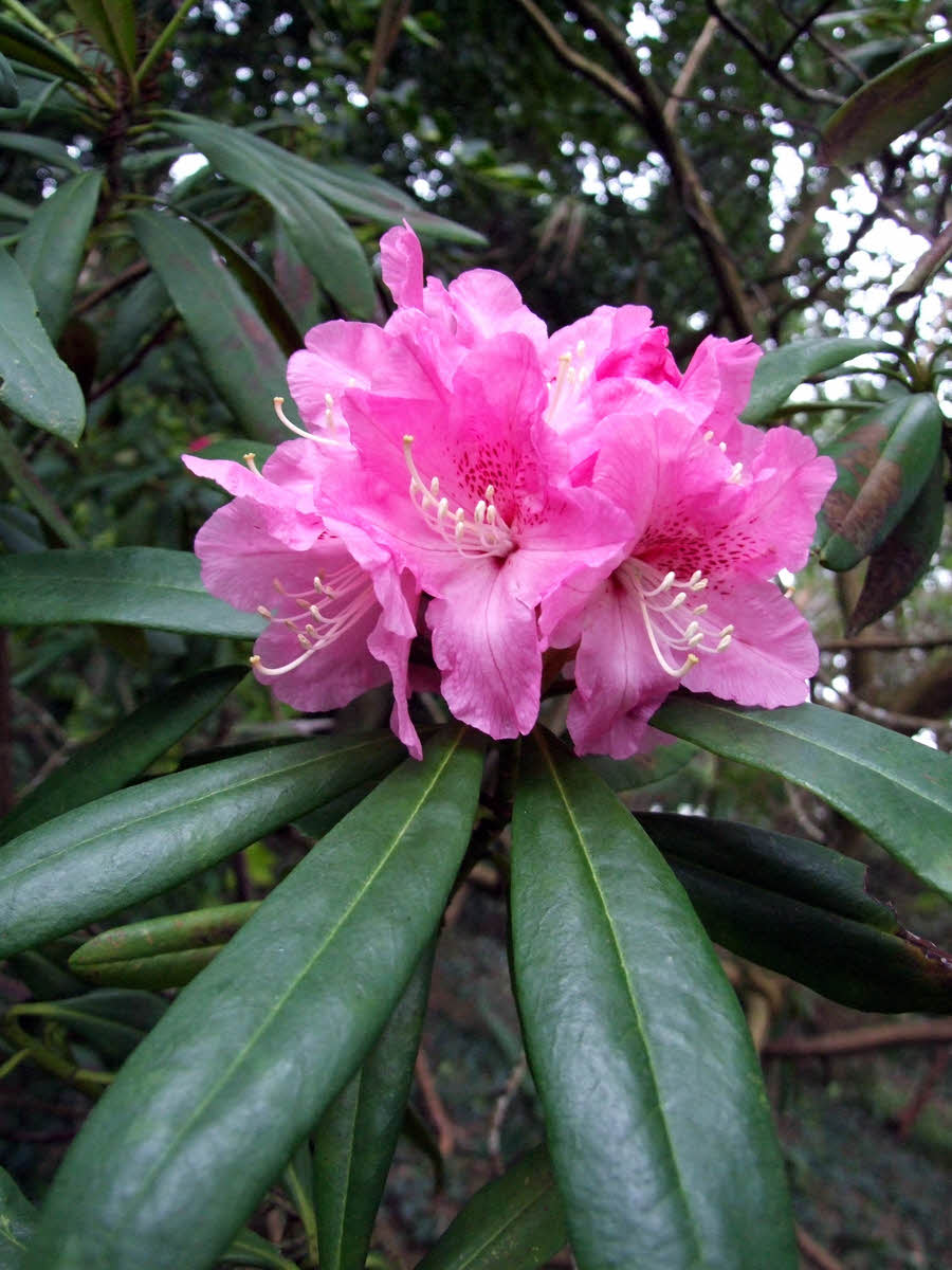 Flowers: up to 20/compact truss, funnel-shaped, 45 x 60-70mm, glistening pink shading to a white centre, with a small pattern of dark crimson markings at the base of the dorsal lobe; nectaries crimson.