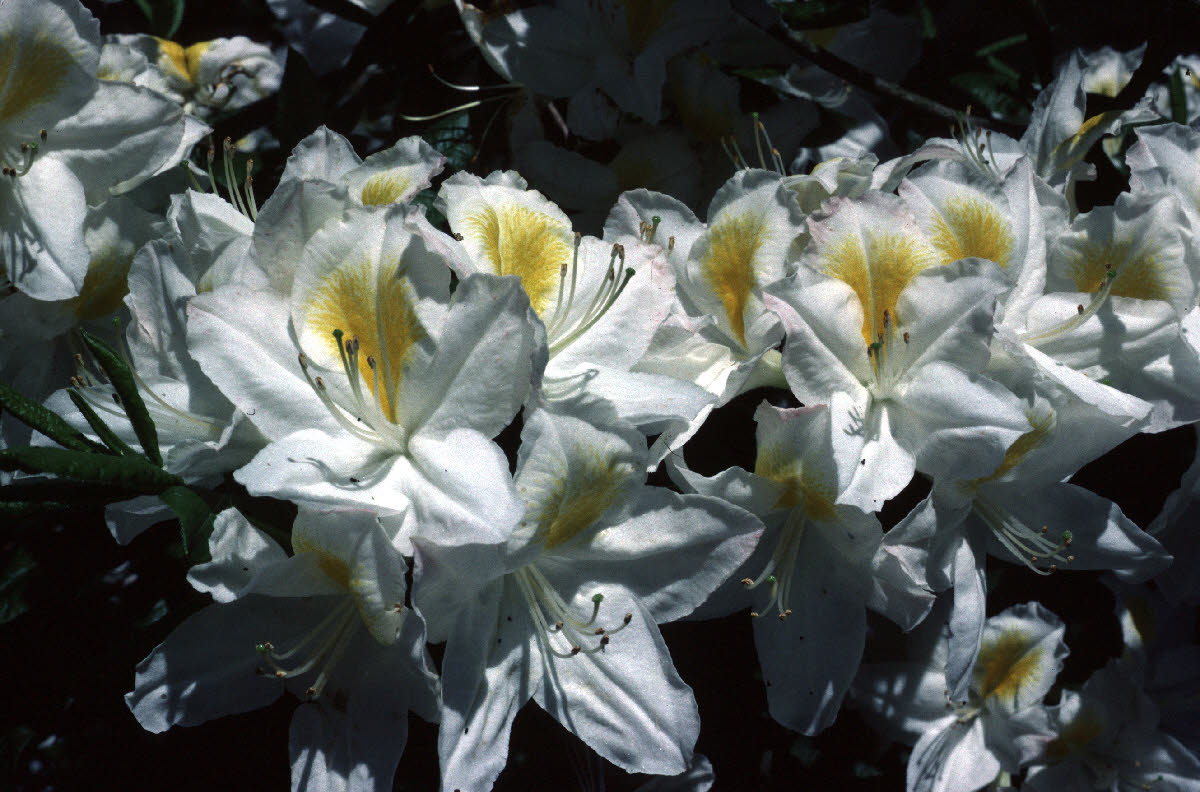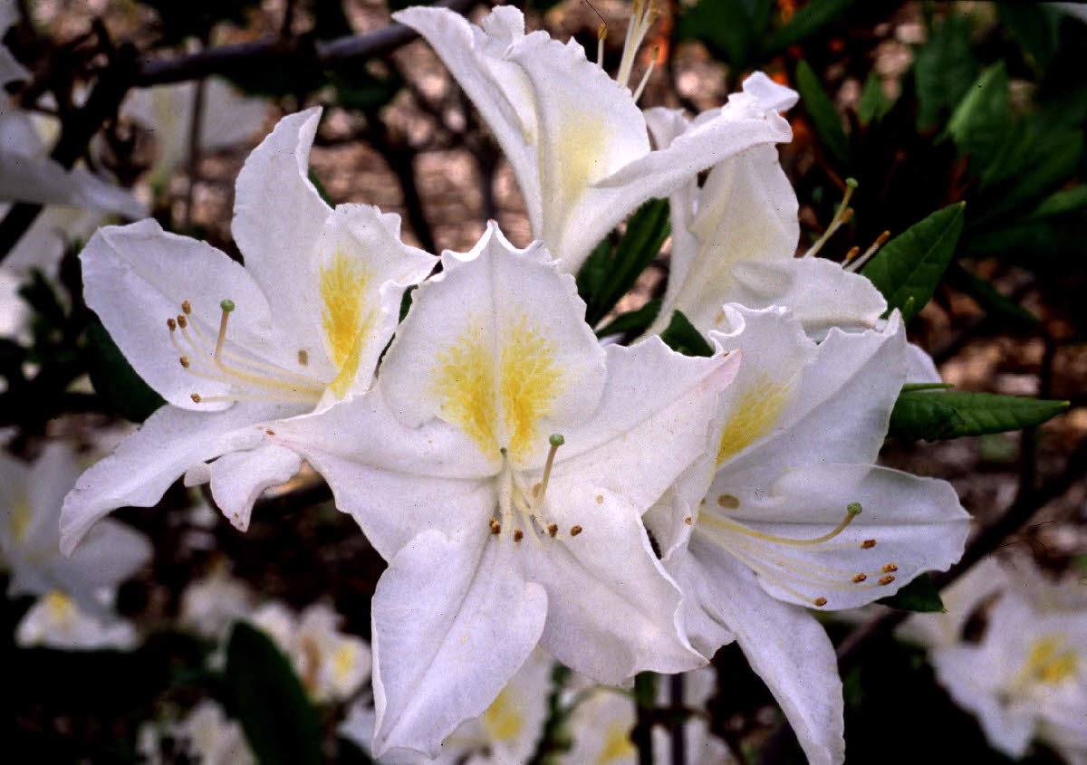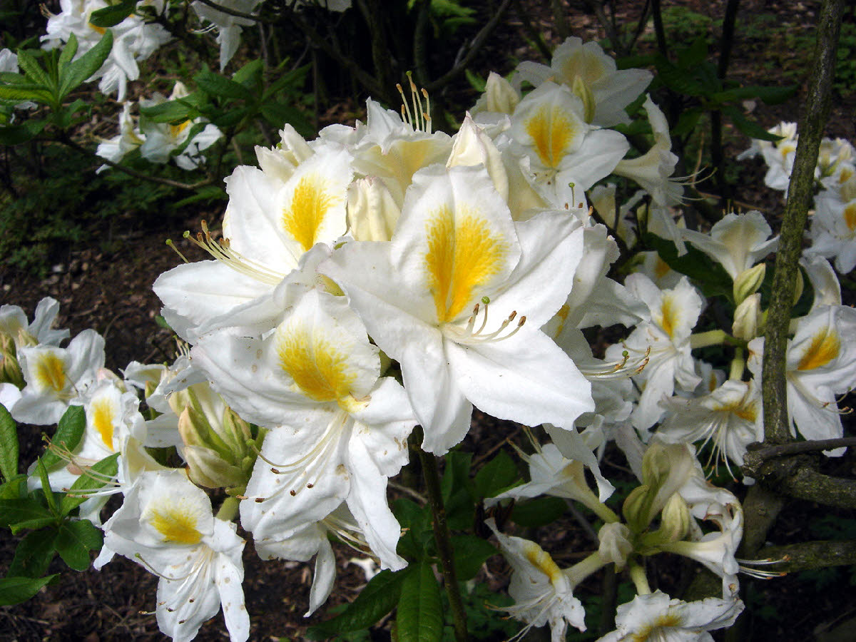 Flowers: compact trusses of up to 20 white flowers (to 5.5cm) with an orange-yellow flare.