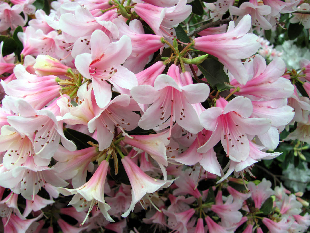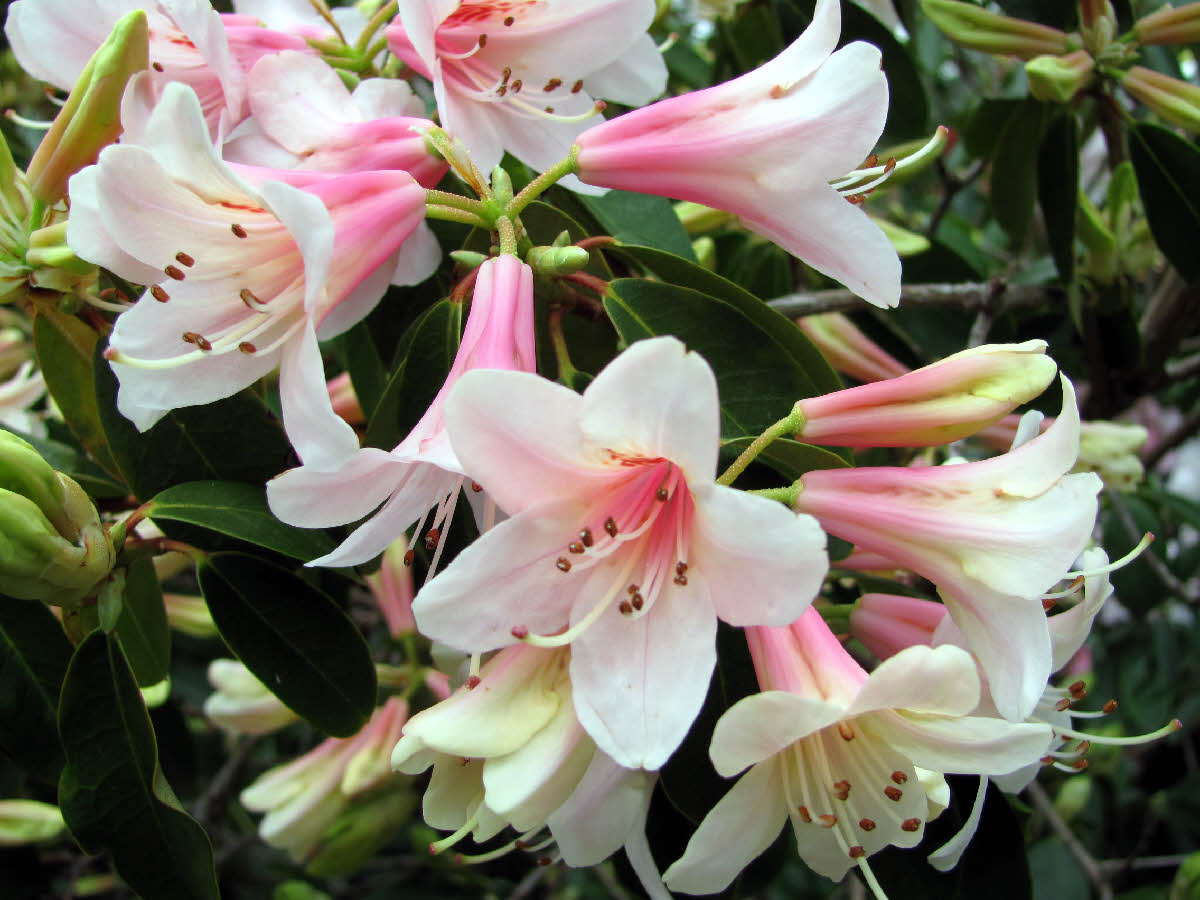 Flowers: 4-5/truss, up to 40 x 40mm, 5-lobed, pale purplish pink, shading to pale yellowish pink in centre