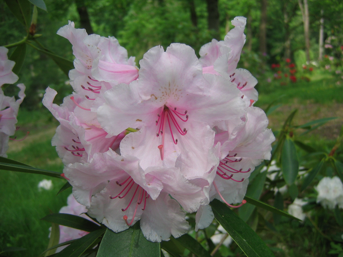 Flowers: up to 19/conical truss, broadly funnel-shaped, 65 x 90-105mm, 5-lobed, rose in bud, opening mottled,