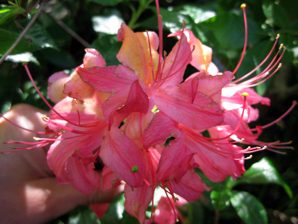 Flowers: single, 10-15/loose truss, broadly tubular funnel-shaped, 60 × 75mm, with 5 wavy-edged lobes, buds strong purplish red (63B),opening inside deep purplish pink (58D),outside strong purplish pink (62A); strong orange (24A) blotch on three dorsal lobes. Calyx 1mm long, light yellow-green (142C).