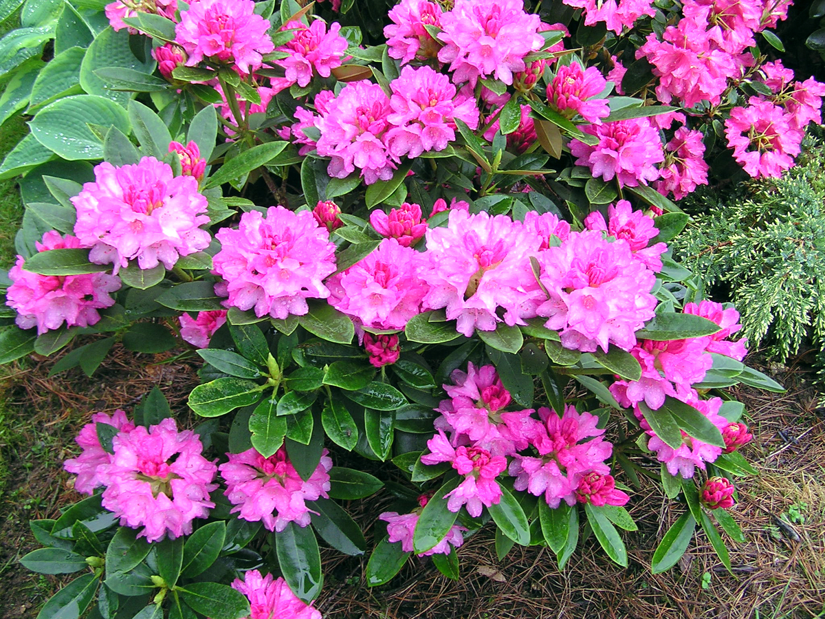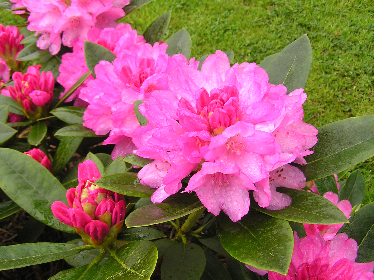 Flowers: 18-20 domed truss, broadly funnel-campanulate, 44 x 64mm, with 5 wavy-edged lobes, vivid purplish red in bud, opening moderate purplish pink, fading to mottled with vivid purplish red margins and moderate yellow-green speckles in the throat; outside moderate purplish pink, with vivid purplish red at midveins and margins; stamens 10, curved, unequal.