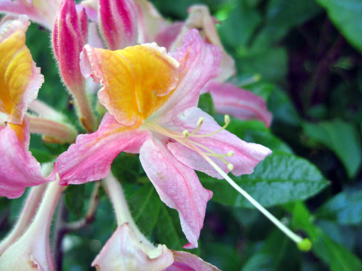 Flowers: single, 10-15/loose truss, broadly tubular funnel-shaped, 50 × 55mm, with 5 wavy-edged lobes, vivid purplish red (57B) in bud, opening moderate purplish pink (62B) inside, deep purplish pink (64D) and white outside, with a brilliant orange-yellow (23B) blotch on the dorsal lobe; slightly scented. Calyx 4mm long, light yellow-green (142C).