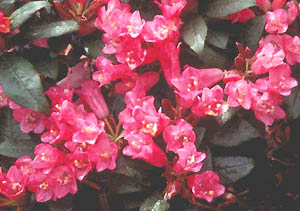 Flowers: clusters of 9 to 12 upright tubular rose pink flowers darker in bud.