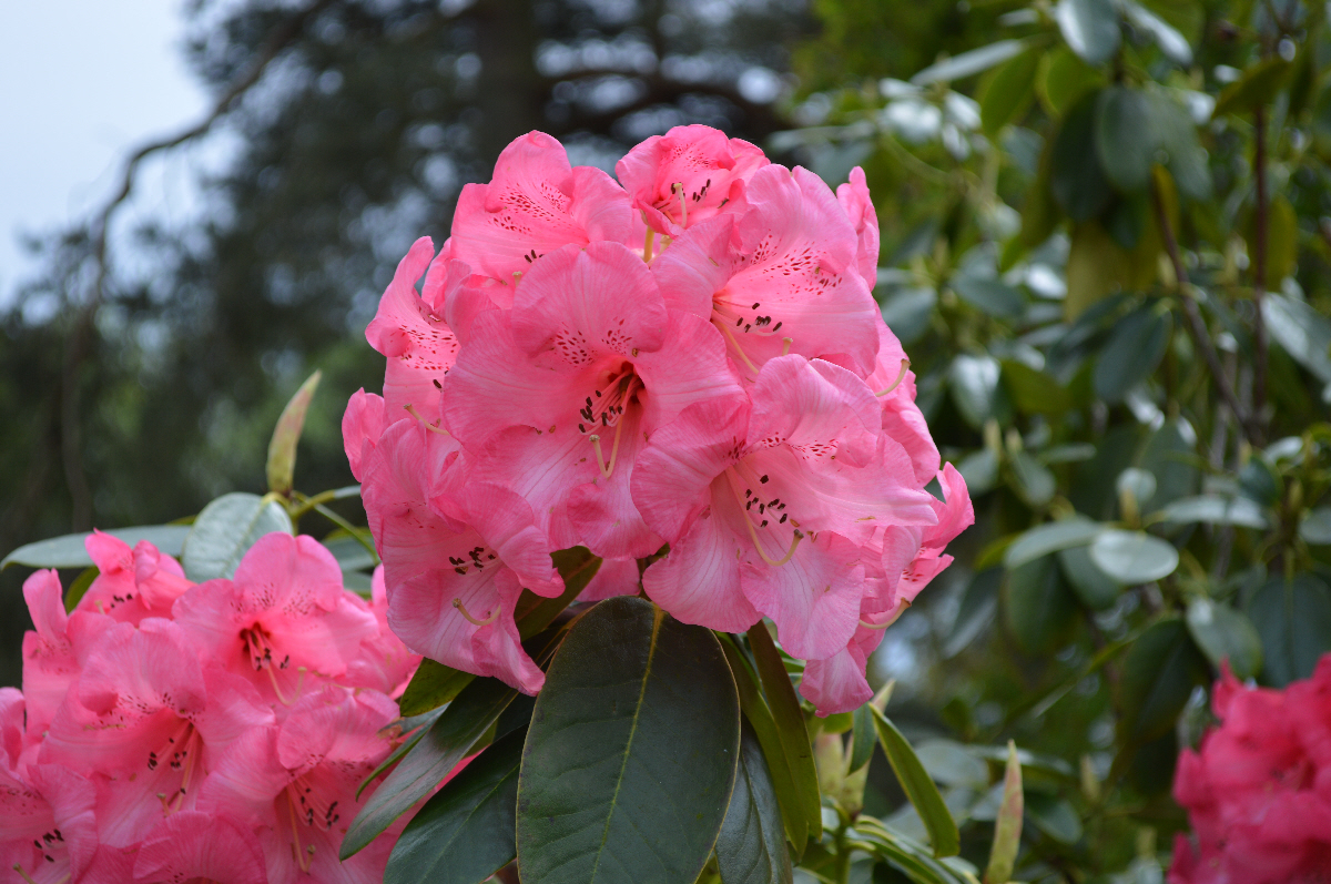Rhododendron 'Red Glow''Halopeanum' x thomsoniiSyn: 'Leonardslee Red Glow' Gem Group Flowers: c8/lax truss, campanulate, 70 x 70mm, 5 lobed, soft rosy red, with a few darker spots at base of dorsal lobe, nectaries black crimson.