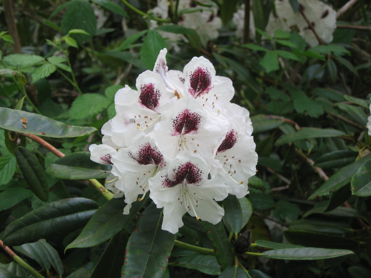 Flowers: c14-15/compact, conical truss, broadly funnel-shaped, 50 x 70-85mm, with wavy-edged lobes, mauve in bud, opening white,