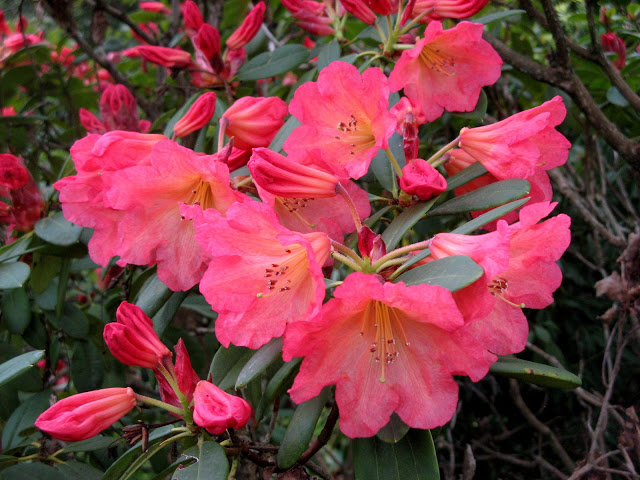 Flowers: 11/domed truss, between open campanulate and funnel campanulate, 55-65 x 80mm, with 5 wavy-edged lobes, moderate red in bud, opening brilliant orange-yellow in centre and at base with deep pink margins inside and out, light dorsal flecking of vivid reddish orange.