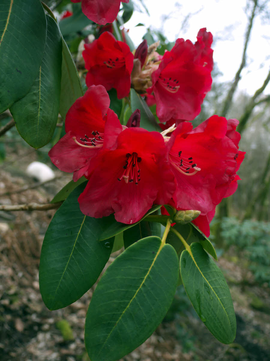 Flowers: 12-15/loose truss, campanulate, 45 x 50mm, blood red with carker veins, and inconspicuous dark brown markings; calyx pale green, flushed crimson, hairless.