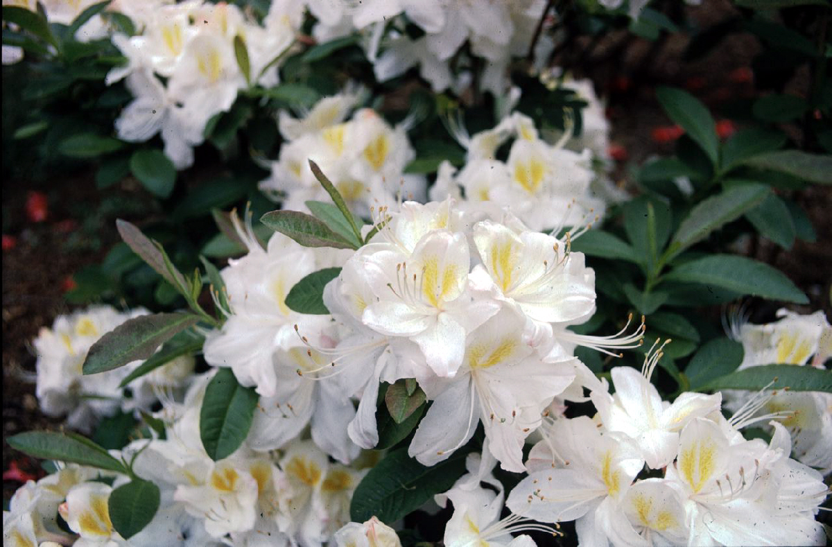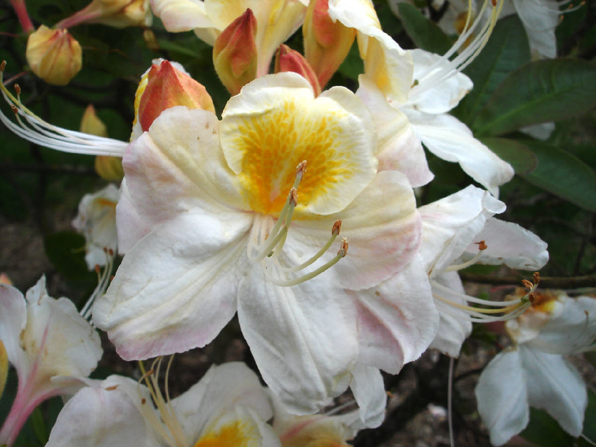 Flowers: rounded trusses of about 14 large, (to 8cm),flowers; white flushed pink with a large orange flare.