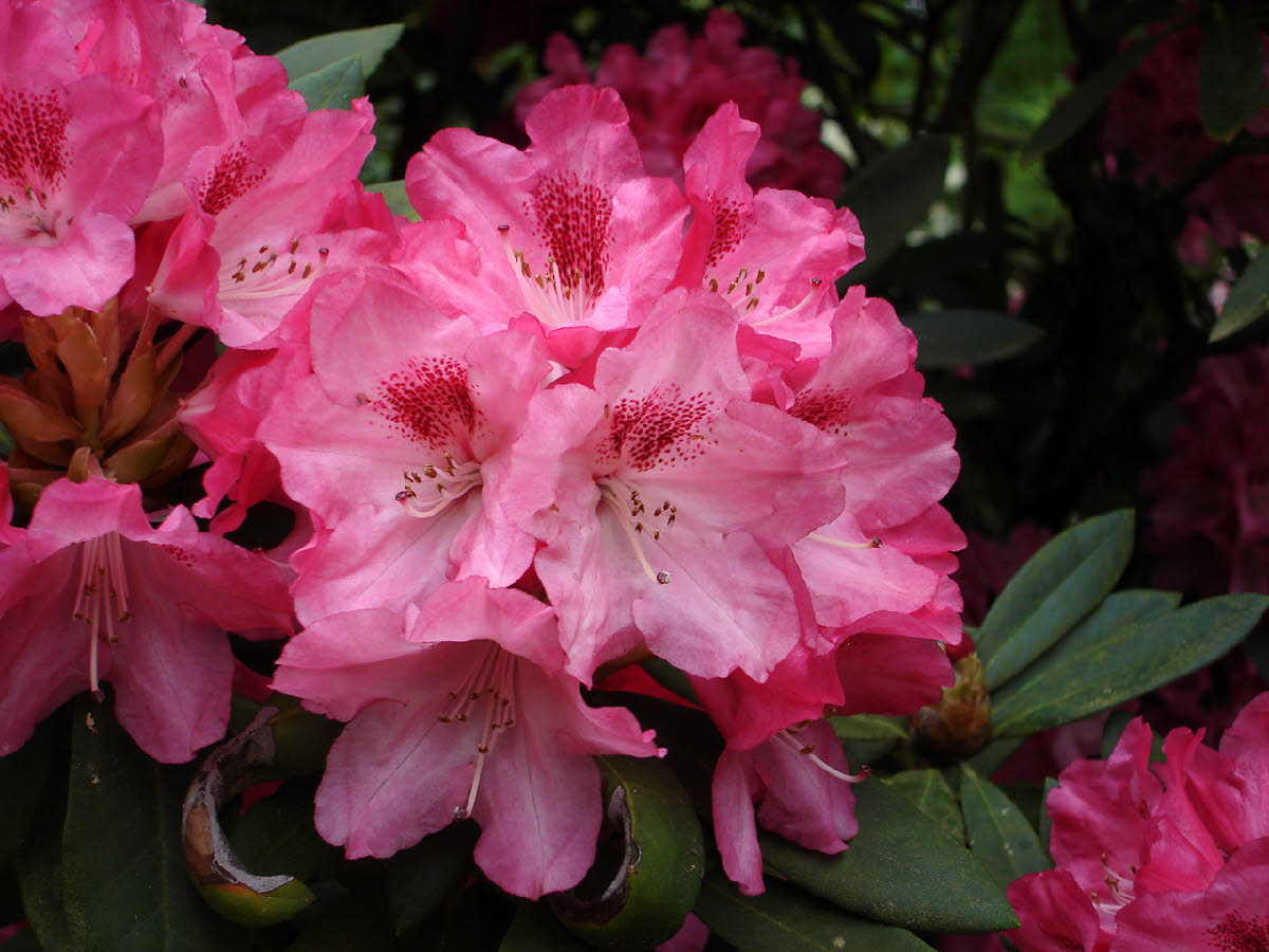 Flowers: 16/compact, domed truss, open funnel-shaped, 50 x 60mm, with wavy-edged margins, deeper and duller than strong purplish pink, fading to white in the throat, basal half of dorsal lobe heavily spotted deep red.