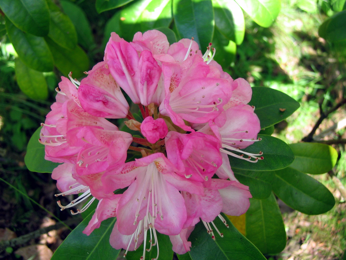 Flowers: c18/rounded truss, broadly funnel-shaped, 50 x 80mm, deep pink in bud, opening white, edged delicate pink,