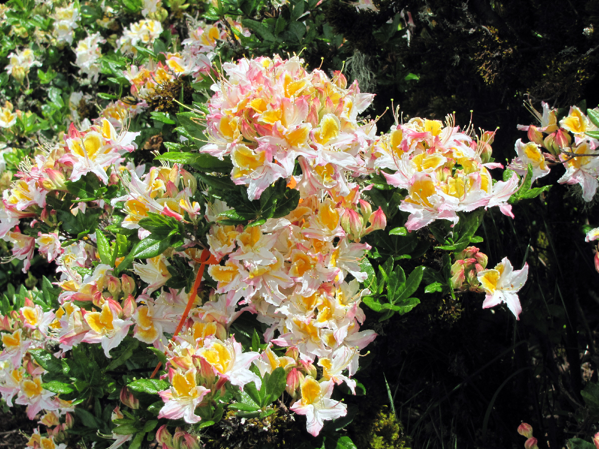 Flowers: 15-19/flat truss, tubular funnel-shaped, 50 x 55mm, 5 very wavy edged lobes, opens white inside with strong orange-yellow on dorsal and adjacent lobes and strong pink on all except dorsal lobe; strongly scented.