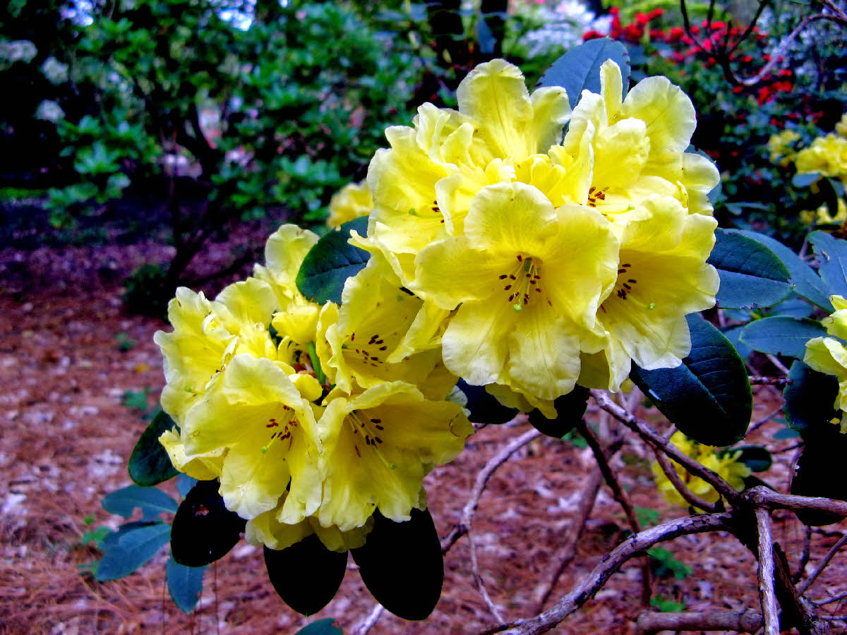 Flowers: 15/truss, open funnel-shaped, 50 x 75mm, with 5-7 wavy-edged lobes, brilliant yellow, shading to light greenish yellow at edges, unmarked.