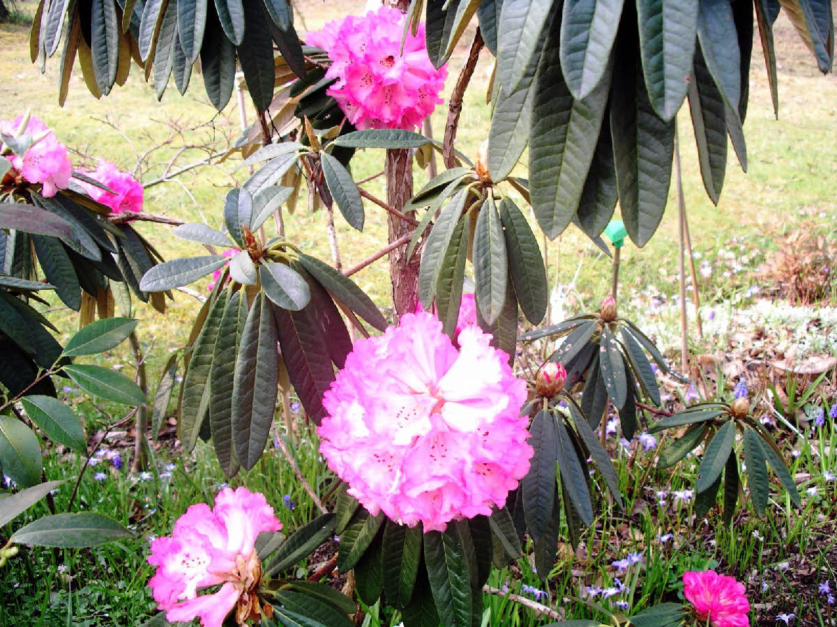 Rhododendron 'Tony Schilling' selection from arboreum ssp. cinnamomeum var. roseum FCC 1974 Flowers: mid rose pink, spotted and streaked crimson, dorsal nectar pouch blotched purple-red.