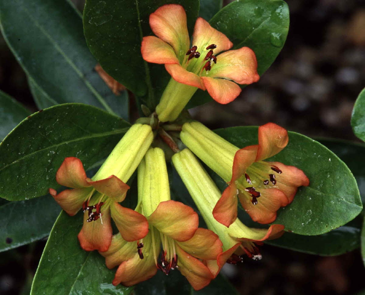 Flowers: 2-5 flowered, an open umbel, tubular, yellow shading to orange, especially at lobes, and yellow or green on the tube; tube 25-35 x 7-10 x 15-20mm.