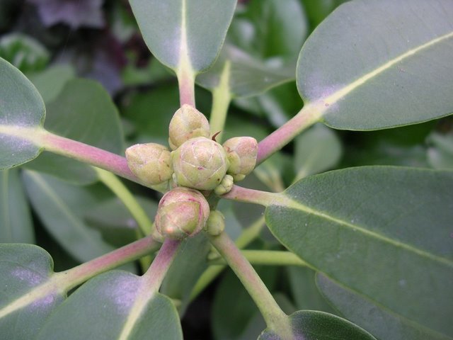 Recognise by: elliptic or ovate matt wax coated olive green leaves with a