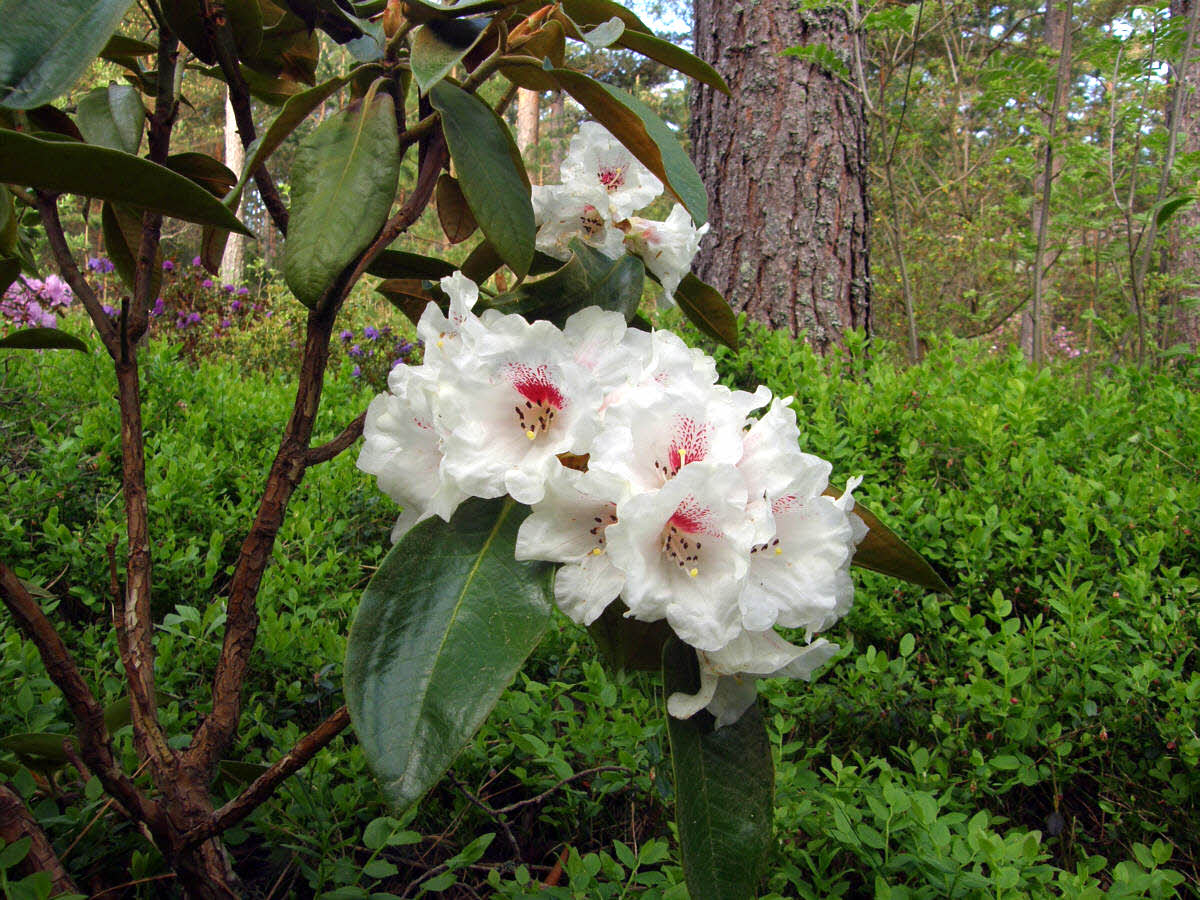 Flowers: trusses of 6-20 flowers, campanulate, 36-56mm long, white, with red spots.
