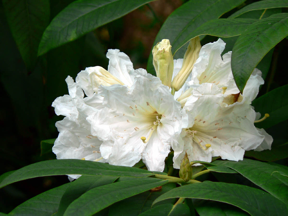 Flowers: 5-18/truss, funnel-campanulate, 50-90mm x 48-80mm, 7-8 lobes, white shading to pale yellow in the throat with or without some orange markings.