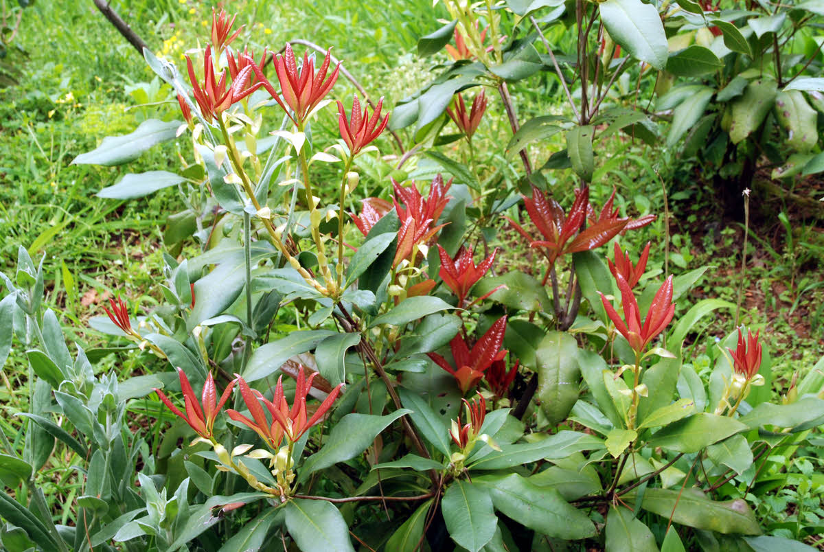 Leaves: evergreen, oblanceolate, elliptic-lanceolate, oblong-obovate, obovate, elliptic or oblong-lanceolate, coriacious, 85-135 x 28-50mm, upper surface green, glabrous, eglandular, margin slightly recurved or flat, underside pale green, glabrous, eglandular.