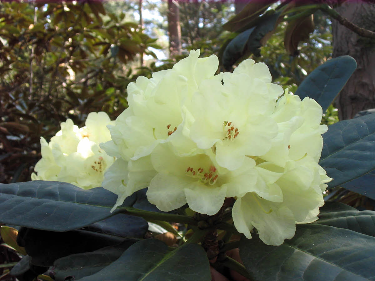 Flowers: compact truss of 12-30 flowers, broadly campanulate, 35-50mm long, yellow, pale yellow or clear canary yellow, sometimes tinged with pink, rarely pure white, with or without crimson blotch.
