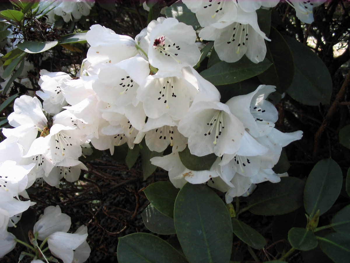 Flowers: trusses of 6-10 flowers, campanulate, 26-35mm long, white, pink or white suffused with pink, with or without deep purple blotch, with or without dark spots.