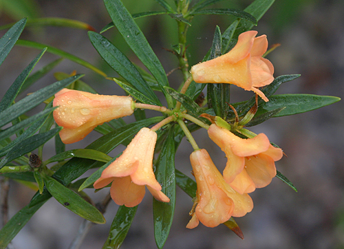 Foliage: narrowly elliptic to almost linear, 56-80 x 7-14mm, 3-5 together in tight pseudowhorls.