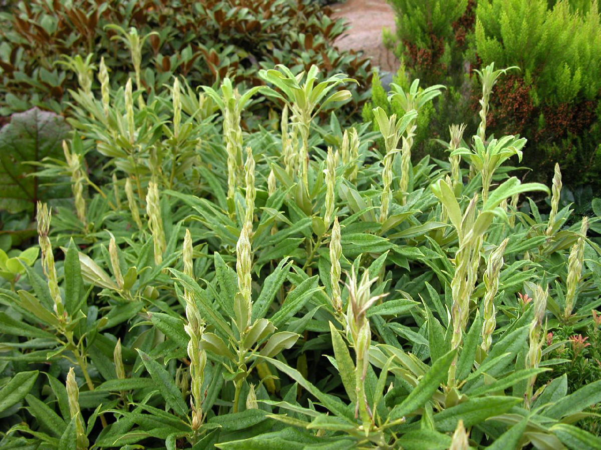Foliage: oblanceolate or lanceolate, 40-95 x 9-25mm, upper surface matt, glabrous, or with vestiges of hairs, midrib grooved, hairy with vestiges of hairs, glandular; lower surface somewhat thick, woolly, continuous, brown indumentum.