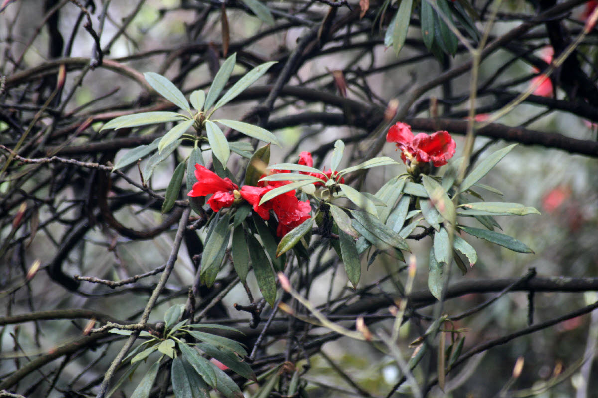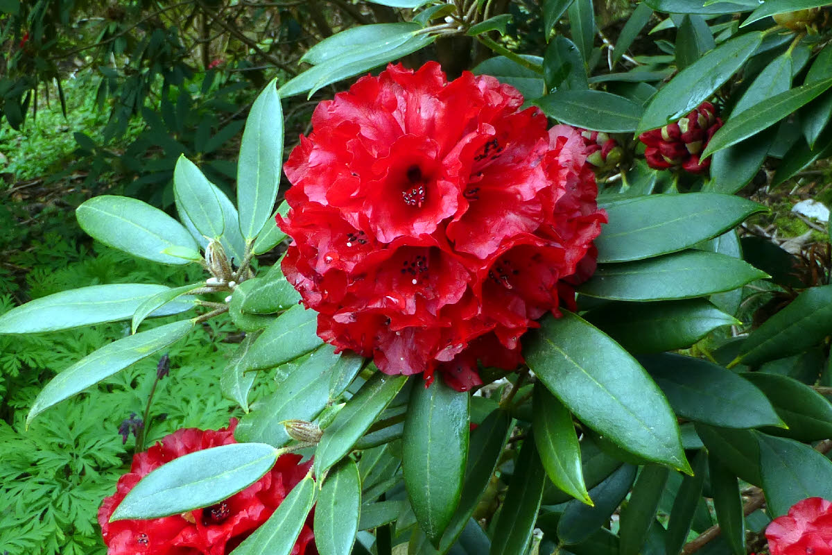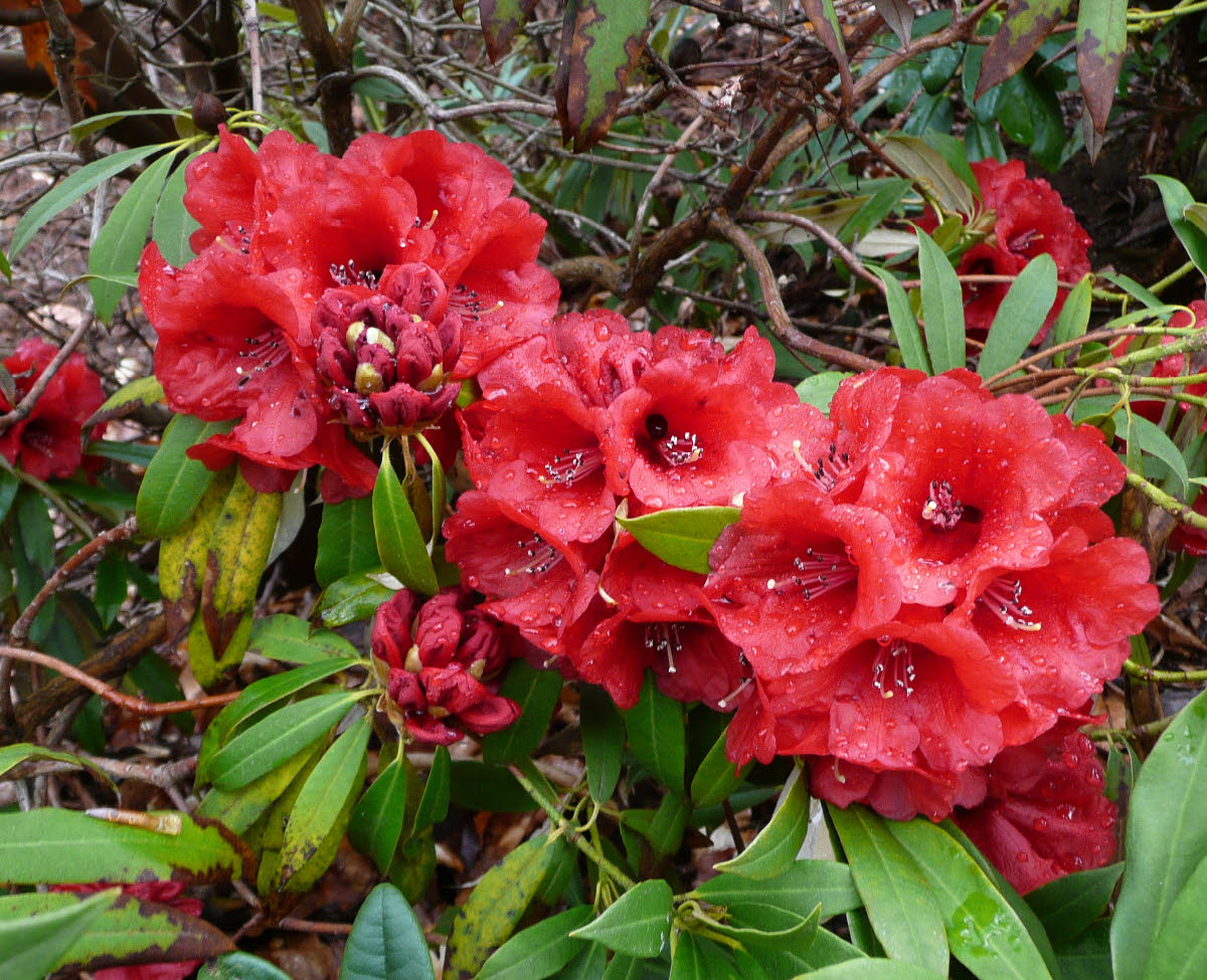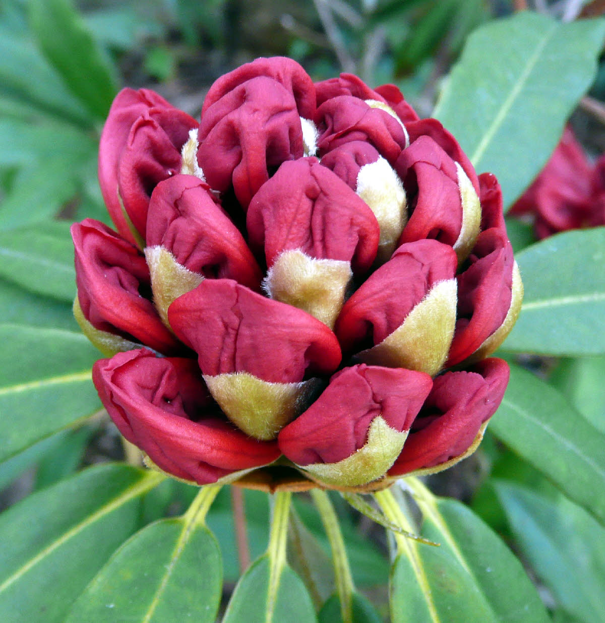 Flowers: 6-12/truss, broadly campanulate or tubular-campanulate, 25 - 40mm long, crimson, unspotted, 5 nectar pouches at base.