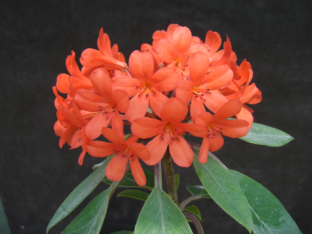 Flowers: up to 30 horizontal or semi-erect flowers in a full umbel, funnel-shaped, 30-35 x 40-48mm, brilliant pink,
