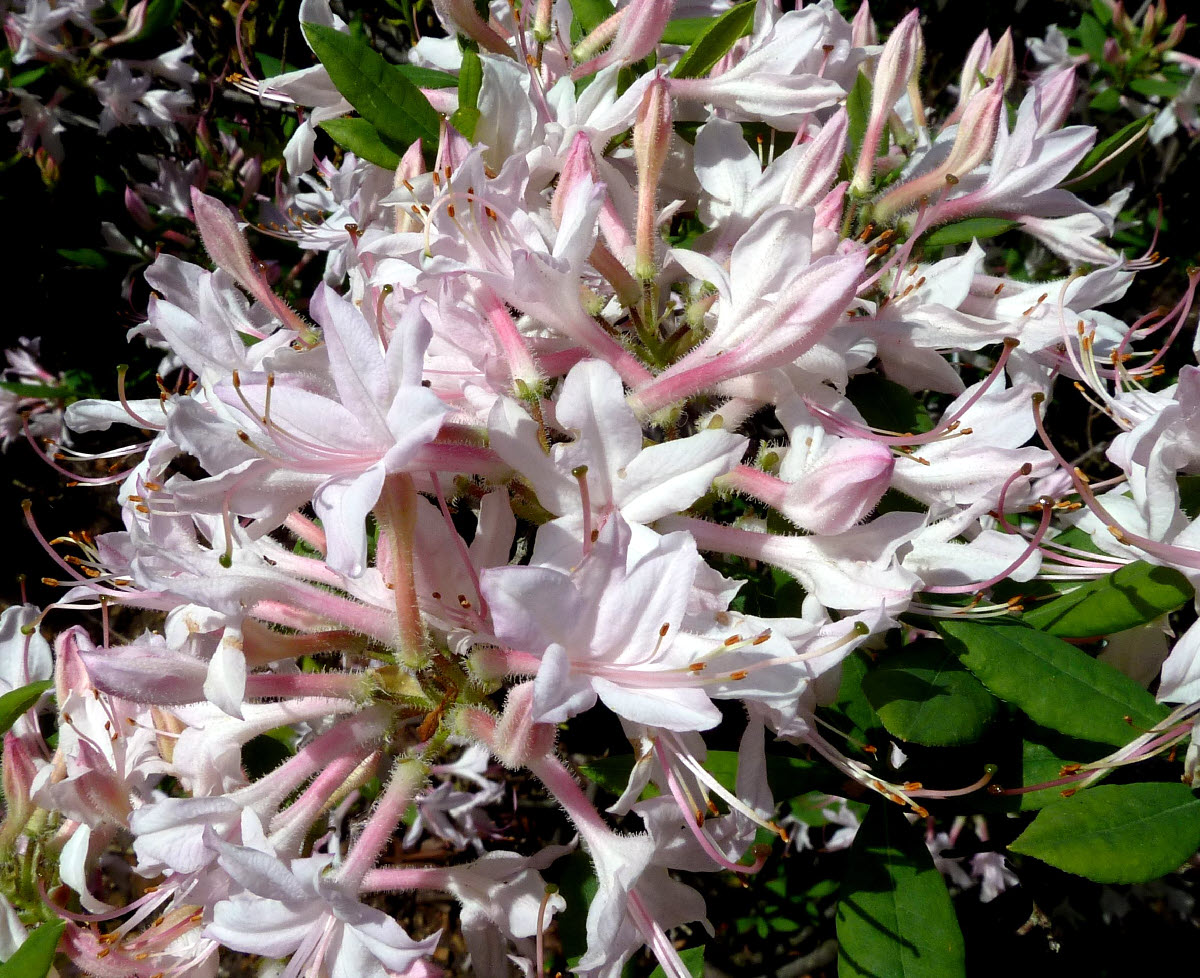 Flowers: 5-9/truss, tubular funnel-shaped, 28-35mm long, pink or purplish-pink, rarely white, with or without brown-red botch; clove scented; glandular.