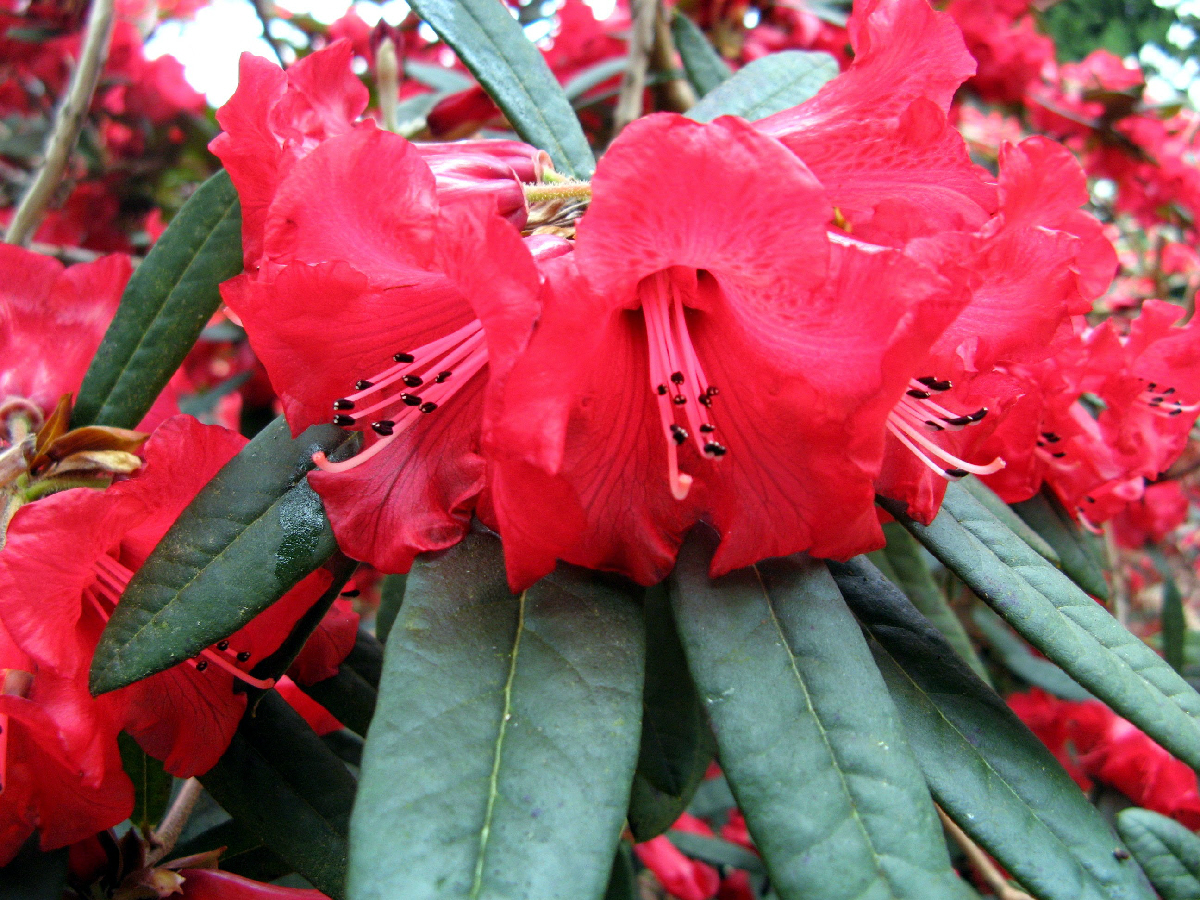Flowers: 3-5/truss, tubular-campanulate, 26 - 45mm long, scarlet, crimson or deep crimson, 5 nectar pouches.