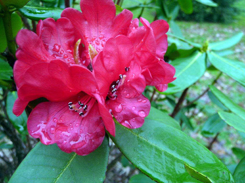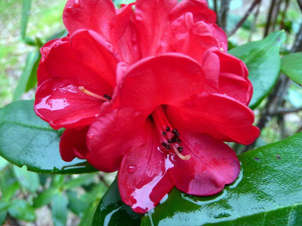 Flowers: 10-15/compact rounded truss, tubular-campanulate, 23-35mm long, crimson or scarlet, 5 deep crimson nectar pouches.