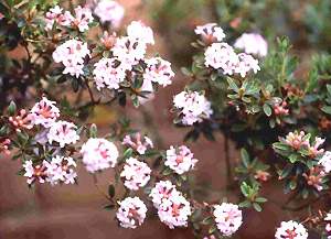 Flowers: clusters of many red purple tubular flowers to 1cm in a racemose umbel.
