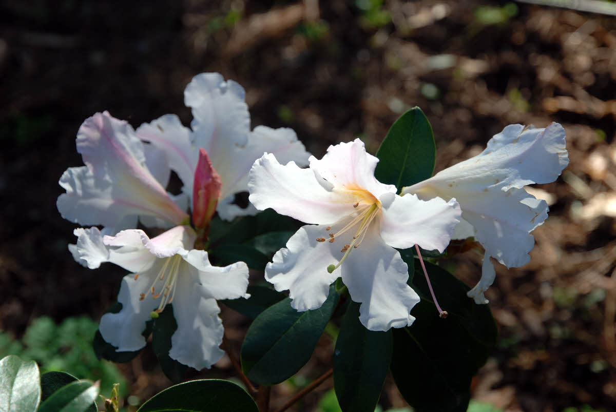 Flowers:5/loose flat-topped truss, 75 x 115mm, white, with an orange-yellow blotch in the throat and some flowers tinged pinkish; slightly scented.