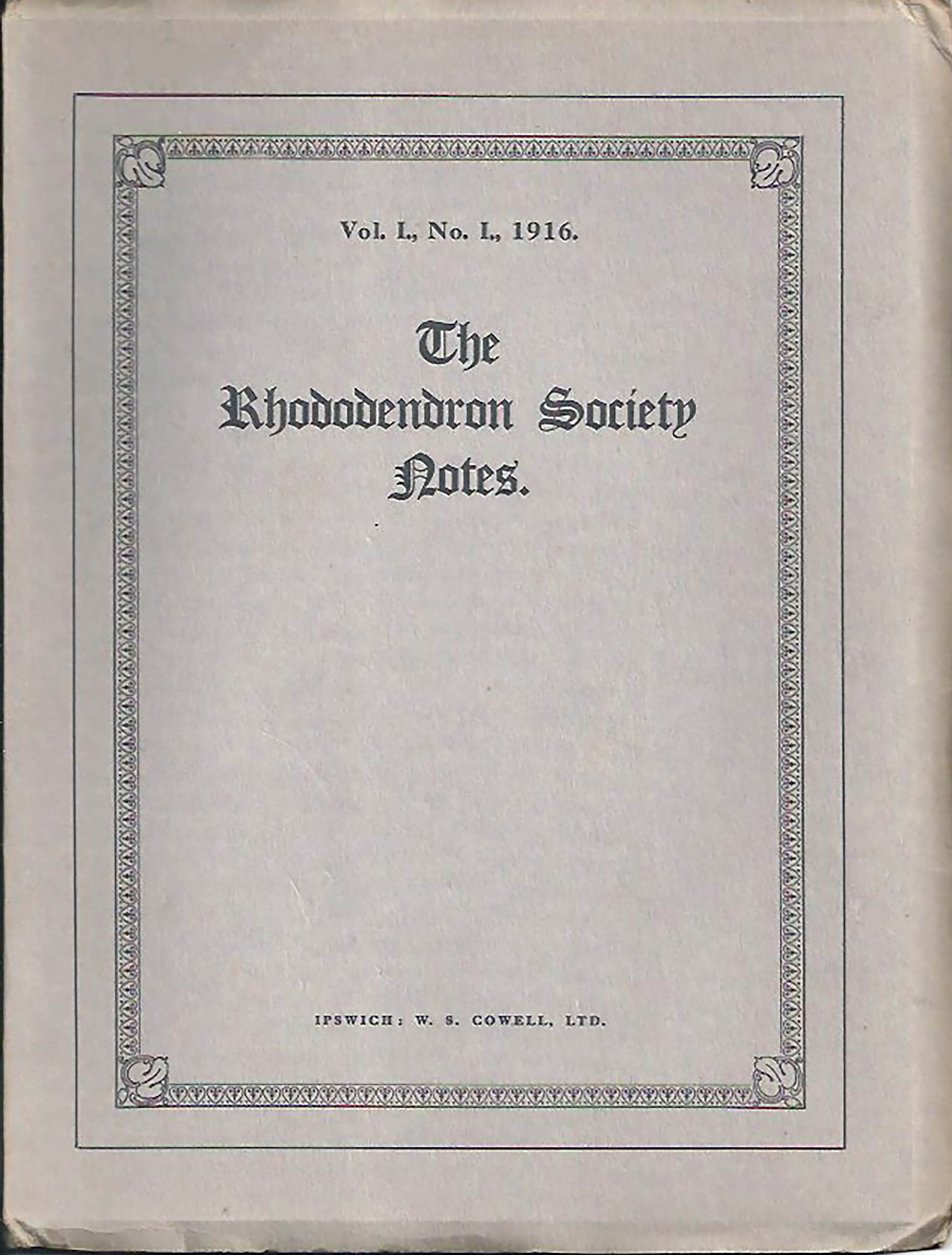 The Rhododendron Society was the forerunner of the Rhododendron, Camellia and Magnolia Group. Formed in 1915 by Charles Eley, J G Millais and PD Williams, one of the conditions of membership was the requirement to contribute occasional notes about the burgeoning number of new species of rhododendrons and the developing skills required to grow them successfully. These offerings were collated and published in fifteen parts – three volumes of five parts each – between 1917 and 1931.
